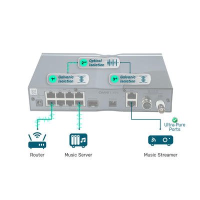 Dreistufige Isolierung: der OMNI LAN wandelt das vom Router eingehende LAN-Signal in Licht um und wieder zurück und regeneriert das Signal ohne Interferenzen